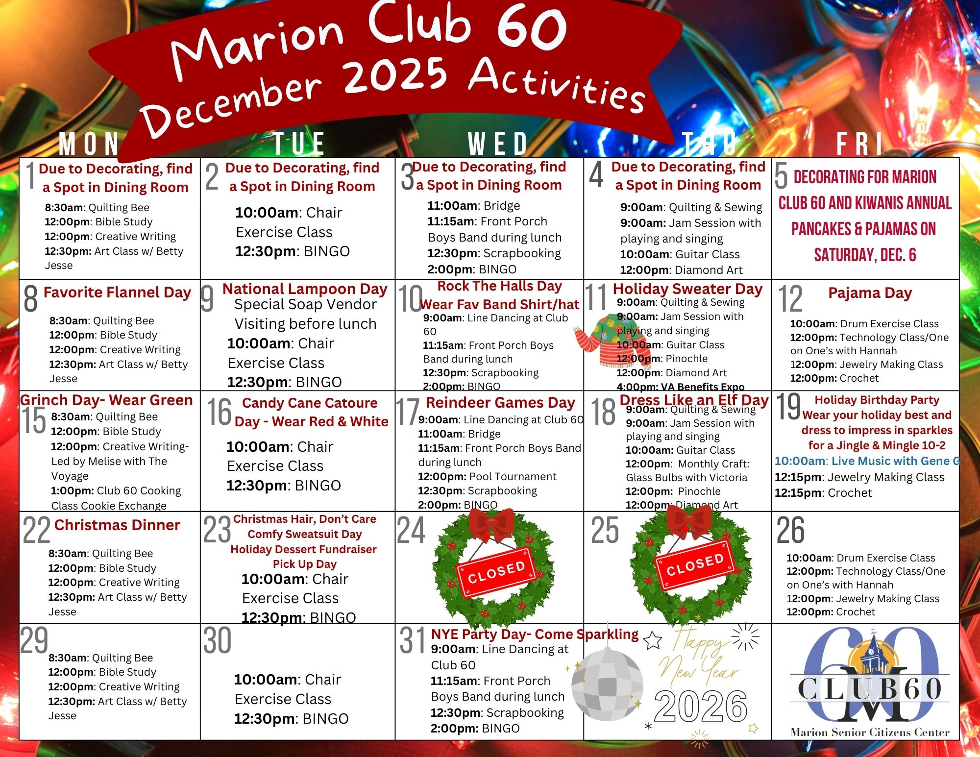 Club 60 offers a wide variety of educational and fun activities and meals for our Club 60 community. Would you like to join in on the fun?