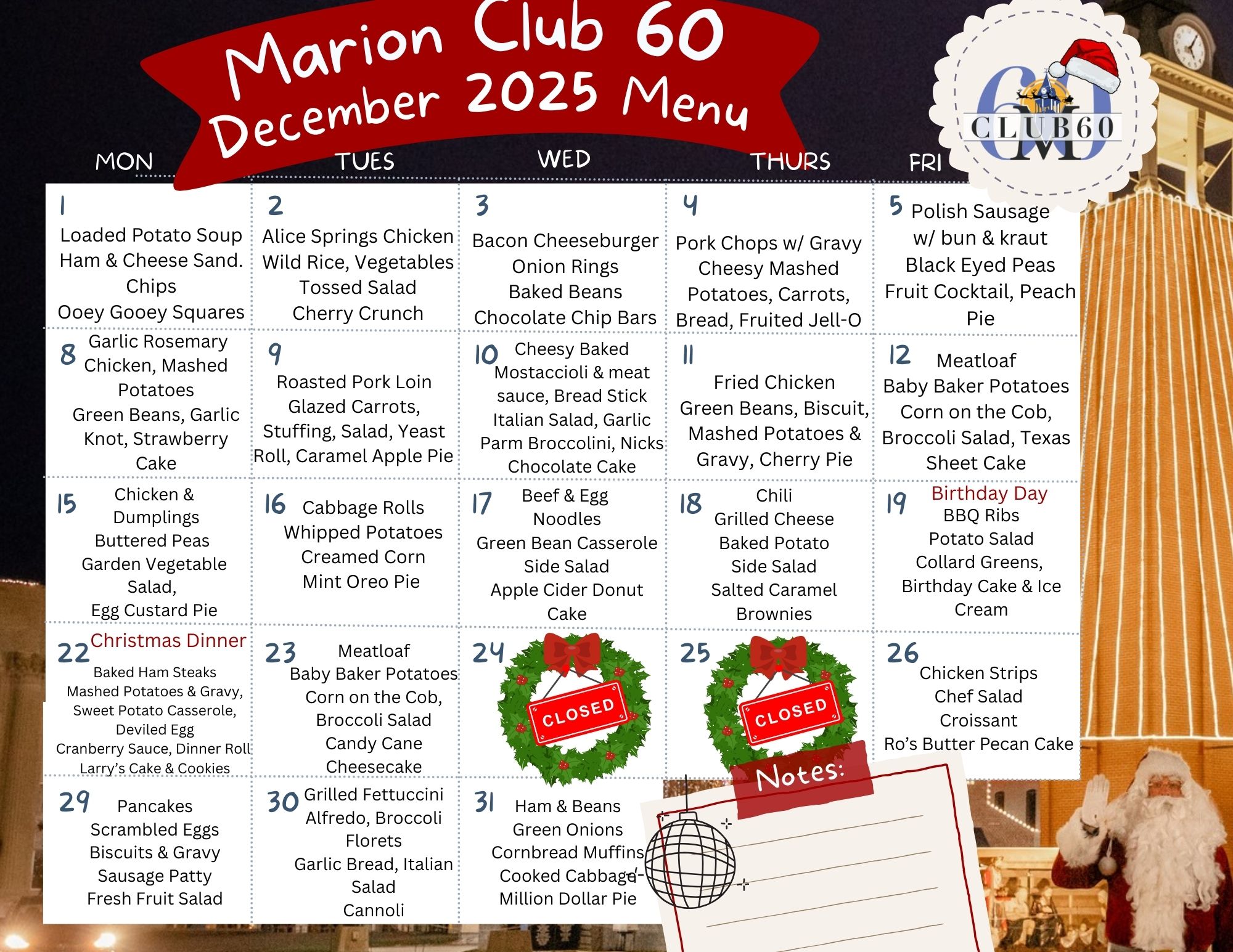 - Carry out meals are served at 11:30 a.m.
